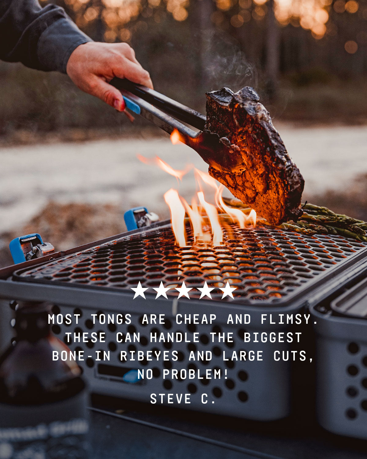 Built to handle thick cuts of bone-in ribeye, a full rack of ribs, or a spatchcock chicken — not all tongs are created equal. We build tools to make sure your dinner doesn't end up in the dirt.